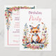 Una dulce y pequeña zorrita rodeada de flores rosas y azules ilustración de acuarela para invitaciones de tarjeta postal de fiesta de cumpleaños de niña.
