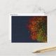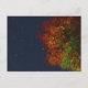 Mirando hacia arriba a través de las ramas de un árbol que se alza en otoño. Las hojas que caen de burdeos, rojos, dorados, naranjas, amarillos y azules brillan contra el cielo azul profundo.