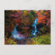 Esta es una imagen de cascadas rodeadas de árboles coloridos en una postal.