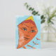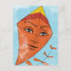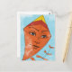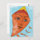 Una postal de cometas fresca, extraña y única que presenta una cometa naranja sobre un fondo azul del cielo y un rostro humano inusual.