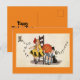 La imagen vintage de un chica y un niño con un gato negro y calabaza aparece en esta postal de Halloween. En la parte delantera de la tarjeta se puede leer "Saludos de Halloween" y en la parte trasera de la tarjeta postal se puede leer "¡Feliz Truco o trato también!" ¡Una postal bonita para enviar a la familia, amigos o niños!