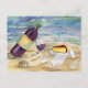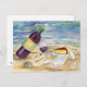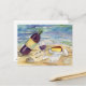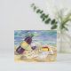 Una botella de vino tinto se inclina contra una copa de vino en la playa. Una bandeja de queso está lista para ser cortada, así como un segundo vino está listo para ser rellenado. En la playa de arena se entremezclan las tumbonas. Las suaves olas del océano en tonos pastel alegran el fondo. La etiqueta del vino puede ser personalizada para su propio mensaje en una botella! Pintura representada en acuarela. Haz postales especiales de fiesta de la playa de vino tinto con tu propio texto e imágenes usando la opción "Personalizar It" para vacaciones personalizadas y ocasiones especiales de la vida del vino regalos!