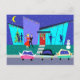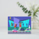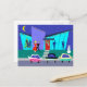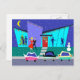 Esta postal de Navidades Fiestas de Personalizados de vacaciones retro te pondrá en el espíritu de las vacaciones. El diseño de esta casa moderna de mediados de siglo es exterior. A través de las paredes de cristal color turquesa del suelo al techo se pueden ver las siluetas azul marino de los fiestas festivos. Hay una pareja conversando frente a un árbol de Navidad verde, decorado con adornos verde azulados. En el lado opuesto de la sala, se ve a un bailarín y al hombre de larga trayectoria que todos intentan evitar. El exterior de la casa cuenta con una alegre puerta roja con una corona de feriado, una chimenea de ladrillo violeta de gran tamaño y varias lámparas de Navidad coloridas. Una pasarela gris está cortando una franja hacia la puerta principal, a través del césped verde azulado. La escena nocturna tiene un cielo azul oscuro con una luna amarilla y creciente. El muñeco de nieve de plástico que decora el patio delantero es recibido por las primeras ráfagas de nieve de la temporada. Una pareja atractiva está haciendo la cha-cha-cha en el camino a su auto. La rubia lleva puesto un vestido rojo brillante. Ella está sosteniendo un brote de mistletoe en una mano. Su guapa escolta lleva puesto un traje negro y una corbata roja. Sus manos están envueltas alrededor de la cintura de la mujer. En la calle, frente a la casa, podemos ver tres coches clásicos de colores vivos. ¡Pida hoy y fiesta como si fuera 1959!