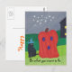 Dibujo artístico de una calabaza con una cara fantasma y un gato negro con un gorra mago, impreso en postales. Ideal para saludos de Halloween y invitaciones a fiestas de disfraces.