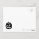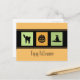 Postales felices de Halloween con ilustraciones divertidos de un gorra brujo, gato negro y calabaza, en naranja, negro y verde.