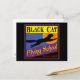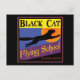 Arte de Halloween Retro de la Escuela de Voladores de Gatos Negros. Un gato negro mágico vuela a través de un espeluznante cielo azul con una luna naranja. Diseño artístico de Halloween de estilo vintage de AngelCityArt.