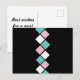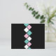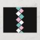 Para los amantes de un estilo de vida retro... Un fondo negro con un patrón de diamante acuático, arlequín rosa y blanco... inspirado en los estilos modernos de mediados de siglo... En la parte de atrás se lee... "¡Mis mejores deseos para un día memorable!"... Una gran idea de regalo... para cumpleaños, celebraciones, fiestas y más... añade un toque de encanto a tus saludos...