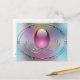 Diseño azul pastel, lavanda y rosa con un huevo rosa translúcido en un entorno de fibra de plata, rodeado por un marco ovalado de plata clara y cuatro gemas más lisas como huevos de colores.