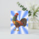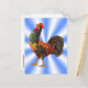 Un colorido gallo de crowing de la vintage cocina con obras de arte en un fondo de estallido azul con espacio para el regreso de tu personalizado en la parte de atrás. Haga clic en Personalizar para cambiar fuentes, colores de fondo y más, incluso para guardar el diseño para más adelante.