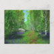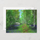Un camino sobrepoblado que serpentea por el bosque de abedules en un soleado día de verano. A la sombra de los árboles, las alfombras de azulejos azules y violetas contrastan con el verde primaveral del césped y los pajardos.