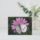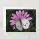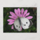 Esta impresionante postal muestra una fotografía de una gran mariposa blanca, también conocida como mariposa blanca de col, sentada en una hermosa flor africana de margarita de color rosado. La mariposa tiene sus alas abiertas que revelan sus hermosas marcas.