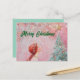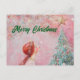 Una tarjeta postal para Navidades cuando estás de viaje y quieres mandar un saludo de vacaciones. El ilustracion delantero muestra un árbol de Navidad y una mujer joven de cabello rojo. El texto principal dice: Feliz Navidad. El texto posterior dice: Y un feliz Año Nuevo.