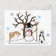 Esta postal tiene Huskies siberianos jugando en la nieve con un muñeco de nieve y cayendo copos de nieve.