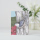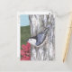 Un Nuthatch de pechos blancos se aferra al costado de un árbol con un arbusto florido rosado mirando desde atrás en la acuarela digital de esta postal.