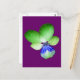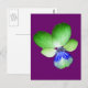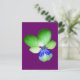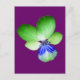 Esta postal muestra una fotografía de una flor Pansy salvaje. La foto ha sido pintada artificialmente, lo que ha resultado en una martilleja con pétalos verdes brillantes y un centro azul brillante. El fondo es morado para complementar los colores de la flor.