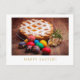 Postal de Pascua con tarta italiana de queso pasttiera y huevos de colores.