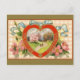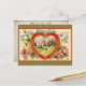 Hermosamente restaura el antiguo saludo de San Valentín con una pareja en una escena campestre enmarcada por un corazón rojo adornado con flores de cerezo rosas y una cinta de satén azul en un fondo rosa de gingham.