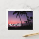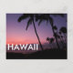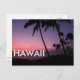Postal de un cielo rosa y morado durante la puesta de sol en una playa con palmeras negras de silueta en la isla tropical de Maui, Hawaii, con el texto: 'Hawaii'.