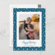 Fotografía azul personalizado postales de vacaciones con estrellas y un hermoso título de escritura festivo. Personaliza fácilmente estas postales de vacaciones de fotos azules con tu imagen y un nombre de familia. Personalizado Feliz Navidad disponible dentro de la herramienta de diseño - hazlo visible personalizando esta plantilla más. El fondo, el título y el texto se pueden personalizar a cualquier color.