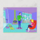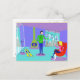 Brrr... Esta postal de vacaciones de esquí retro te hará buscar un San Bernardo con un barril de brandy. El moderno dibujo personalizado de mediados de siglo cuenta con una pareja glamurosa cubierta en un colorido chalé de esquí con unas vistas magníficas. El suelo es de color turquesa y las paredes son violetas. ¡Eh, son los 60! Los ventanales del suelo al techo revelan montañas cubiertas de nieve, un cielo turquesa con nubes azul claro y las siluetas de gente feliz que se pasean en las góndolas del remonte. En el interior de la habitación se ve un verde oliva, una chimenea de conos con una chimenea encendida. En el suelo hay dos esquíes amarillos al lado de los postes de esquí. En el centro de la habitación, un hombre guapo de pelo negro lleva pantalones azules y un suéter verde de cuello alto. Lleva una bandeja de martinis. Un brazo se extiende, ofreciendo un martini a la mano de espera de una mujer rubia. La mujer está sentada en una silla roja de huevo. Lleva pantalones azul marino y un suéter rosado caliente. Por favor, perdónenla por no levantarse, ¡pero tiene un elenco en una pierna!