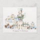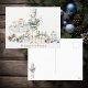 Navidades postales vacacionales con un elegante ilustracion acuático de un pepino en tonos azules con vegetación navideña centrado en un montón de regalos de Navidades elegantemente envueltos con regalos adicionales debajo, pinecones azules y marrones y una linterna colocada entre flores de poinsettia azul. Feliz saludo de feriado y falsos antecedentes texturados en el frente. El ilustracion de petardos se repite al revés.