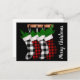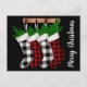 La moderna tarjeta de vacaciones rústica incluye medias de manta de búfalo colgadas con ramas de abeto y texto vertical de personalizable sobre fondo negro.
