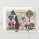 Este diseño vintage pone en relieve un globo de aire caliente vintage, una mujer francesa de moda y flores púrpura y rosa vintage sobre el mapa de París de un turista vintage.