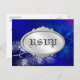 Postales editables de RSVP con letras de guión elegantes y arte vintage de una masa de pino en conos de pino azul y blanco dentro de un marco plateado sobre un fondo azul. Haga clic en Personalizar para agregar su nombre o mensaje, e incluso guarde el diseño para más adelante.