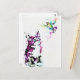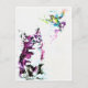 Las acuarelas se usaron para hacer las imágenes de un gatito viendo a un colibrí volando sobre él. Esta es una impresión en una postal.