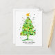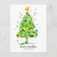 Un divertido y brillante pino árbol navideño con baubles de colores. Pintado a mano con acuarela con una estrella amarilla brillante en la parte superior.
