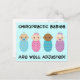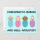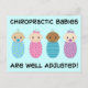 Este diseño cuenta con cuatro lindos bebés multiculturales, niños y chicas, ¡dos incluso tienen pacificadores! El texto dice "¡Los bebés quiroprácticos están bien ajustados!"