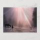 Una postal de un vaquero y un caballo en la "iglesia del vaquero" de un país bonito, Navidades de vacaciones occidentales. Una hermosa luz irradia sobre ellos y el ciervo. Una postal navideña realmente bonito.