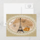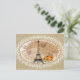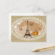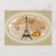 Torre Eiffel sobre un fondo de postales francesas vintage y un mapa de París. Un marco giratorio blanco y bonito y flores amarillas