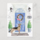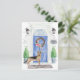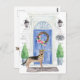 Anuncie su nueva dirección con nuestra elegante invitación con un pastor alemán, puerta delantera azul, alfombra de bienvenida, letrero de pizarra, topiarios y una corona floral sobre un fondo de ladrillo gris.