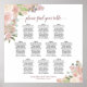 Esta tabla de bodas de 10 mesas presenta un diseño floral de moda boho con rosas acuáticos pintados a mano y flores en tonos rosa rubor, melocotón de coral, rosa polvoriento, malva, hojas de eucalipto y follaje de jardín. La distribución tradicional tiene capacidad para 100 comensales y 10 asientos por mesa. El título presenta una caligrafía de guión elegante y hay espacio para los nombres de la pareja y la fecha boda en la parte inferior. Una forma maravillosa de añadir belleza, elegancia y encanto rústico a tu recepción nupcial, al tiempo que facilita a tus huéspedes la búsqueda de sus asientos.