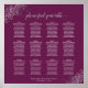 Esta tabla de asientos de 12 bodas de mesa es a la vez sencilla y elegante. Incluye mesas para 120 comensales con 10 asientos por mesa. El diseño presenta texto gris sobre un fondo magenta o morado de cassis con un título de caligrafía de escritura de encaje. Los rincones están decorados con un violín color Relieve metalizado plateado con rizos y remolinos. Elegante, moda y sofisticada manera de ayudar a los huéspedes a encontrar sus asientos en la recepción.