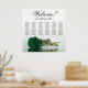 Este cuadro de boda tiene 12 mesas y presenta un diseño romántico, elegante y bonito. Una decoración floral moderna se ve acentuada por un único rosa de color verde esmeralda, de tallo largo, que se encuentra a su lado, reflejado en una piscina de agua. El título, "¡Bienvenidos! por favor, encuentren su mesa", está escrito en lujosa caligrafía de escritura, mientras que los nombres de la pareja y la fecha del boda se muestran en la parte inferior. Con capacidad para 120 personas y 10 asientos por mesa, esta tabla ofrece a sus huéspedes una amplia distribución de asientos para que disfruten de la celebración.