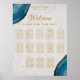 La carta de asientos de boda tiene 13 mesas. En las esquinas, arriba a la izquierda y abajo a la derecha, hay geodas de ágata azules. El fondo es de mármol blanco. Los nombres de los novios están escritos en una elegante letra caligráfica. Todo el texto tiene un color dorado.