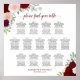 Esta bonita tabla de bodas de 13 mesas presenta un diseño rústico de moda de boho con rosas acuáticos pintados a mano en tonos burdeos, rojos y rosa rubí, rodeados de hojas de eucalipto y vegetación en el jardín. La disposición tradicional tiene capacidad para 130 nombres, con 10 asientos por mesa. El título está escrito en una elegante caligrafía de escritura, y hay espacio para los nombres de la pareja y la fecha boda a continuación. Una forma maravillosa de añadir belleza y estilo a su recepción, al tiempo que facilita a sus huéspedes el acceso a sus asientos.