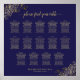 Esta bonita tabla de bodas incluye mesas para 140 personas. El diseño, sencillo pero elegante, incluye texto dorado sobre un fondo azul marino con un título de caligrafía de escritura de encaje. Los rincones están decorados con un Relieve metalizado falso con rizos y remolinos. Elegante, moda y sofisticada manera de ayudar a los huéspedes a encontrar sus asientos en la recepción.