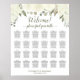 Esta bonita tabla de asientos de 24 bodas cuenta con un diseño floral de moda boho color agua pintada a mano con rosas, flores y flores en tonos marfil, blanco y crema, hojas de eucalipto verde salado y follaje de jardín. El título dice "¡Bienvenidos! por favor, encuentren su mesa" en caligrafía de escritura de encaje. Hay espacio para los nombres de la pareja y la fecha de boda. Esta tabla tiene capacidad para 240 personas con 10 asientos por mesa.