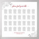 Este bonito cuadro de asientos boda presenta un diseño sencillo y elegante con texto gris oscuro y rojo sobre un fondo blanco. El título está escrito en escritura caligráfica y dice: por favor, encuentre su tabla. La gráfica está decorada con unos rizos de plata de Relieve metalizado de imitación floral y con remolinos en las esquinas. Tiene capacidad para 28 mesas con capacidad para 10 personas por mesa o 280 comensales.