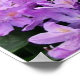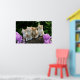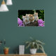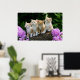 4 gatitos adorables amarillos sentados en un tronco rodeado de flores moradas.
