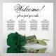 Esta impresionante tabla de bodas tiene cuatro mesas con 10 asientos por mesa, con capacidad para 40 comensales. La carta está decorada con un diseño sofisticado y romántico, con un único rosa de tallo largo de un rico color verde esmeralda, que descansa delicadamente en su costado y hace reflexionar en una piscina de agua tranquila. El título de la gráfica, escrito en graceful script calligraphy, da una cálida bienvenida a los huéspedes con "¡Bienvenidos! Por favor, encuentra tu mesa" mientras deja un amplio espacio debajo para los nombres de la pareja y la fecha del boda. Esta elegante carta de asientos sirve como una forma encantadora y práctica de saludar y ayudar a sus huéspedes a encontrar sus asientos designados en la recepción de su boda.