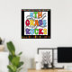Fondo negro colorido y divertido con un diseño de borde colorido, notas musicales y texto multicolor que dice "Rocas de quinto grado" en posters de quinto grado a los que el profesor amará!