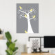 Cinco adorables pájaros amarillos cuelgan en un árbol blanco sobre un fondo gris en un poster. ¡Esta impresión es una gran adición a cualquier habitación!