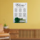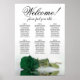 Este bonito cuadro de bodas tiene seis mesas, cada una con capacidad para 10 comensales y un total de 60 comensales. La gráfica presenta un diseño romántico, mostrando un único rosa de color verde esmeralda profundo de tallo largo que descansa delicadamente a su lado y se refleja en una piscina de agua tranquila. El título de la gráfica, representado en una elegante caligrafía de escritura, invita a los huéspedes con "Bienvenida! Por favor, encuentren su mesa", mientras dejan suficiente espacio en la parte inferior para los nombres de la pareja y la fecha de boda. Esta carta de asientos es una forma maravillosa y práctica de saludar a los huéspedes y ayudarlos a encontrar sus asientos en la recepción, exuberante un aire de encanto y sofisticación.