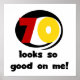 Si usted o alguien que usted conoce cumple 70 años, le encantarán nuestras camisetas de cumpleaños 70 Looks So Good On Me, botones, tarjetas, pegatinas, tazas, imanes y otras prendas de cumpleaños 70 con un diseño de texto negro, rojo y amarillo.