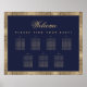Un vintage y elegante plano de asientos con 7 mesas, recomendado para una boda con colores de boda azul marino y dorado. El fondo es azul marino. Tiene bordes dorados florales con decoraciones intrincadas de rosas silvestres. Todo el texto es dorado. La palabra Bienvenidos en la parte superior está escrita en una elegante letra caligráfica, el resto en mayúsculas.