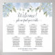 Este bonito cuadro, diseñado específicamente para un boda, muestra una estética rústica de inspiración bohemia con elementos acuáticos pintados a mano como rosas, flores y una variedad de flores en un tinte de color azul polvoriento. La carta se divide en 7 mesas, con capacidad para 70 comensales y capacidad para 10 comensales por mesa. El título, escrito en una elegante caligrafía de escritura, da la bienvenida a los invitados y los guía para encontrar su mesa asignada. Además, el gráfico incluye los nombres de la pareja y su fecha de boda, lo que hace que sea una forma agradable y funcional de saludar a los clientes y ayudarles a encontrar sus asientos en la recepción.